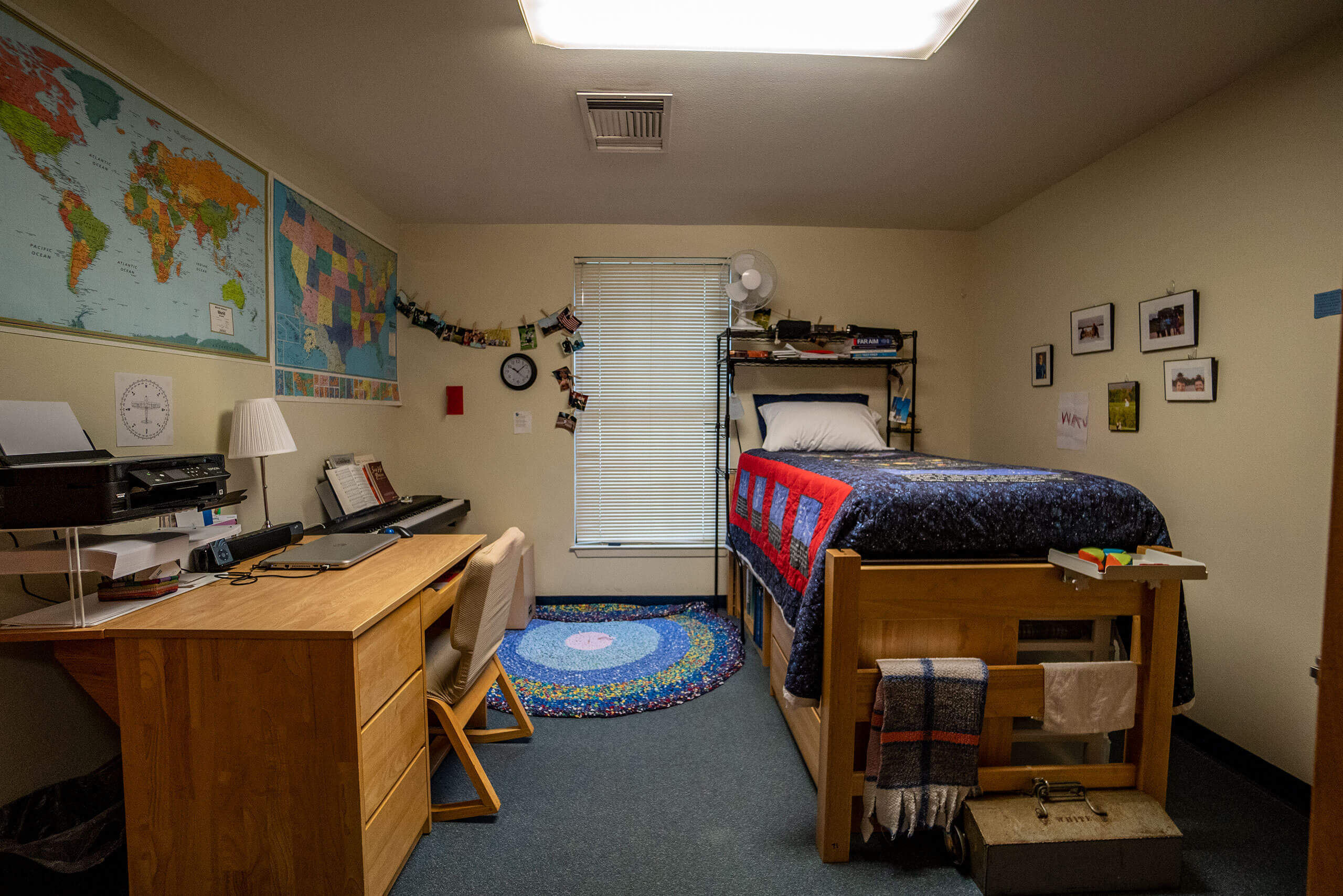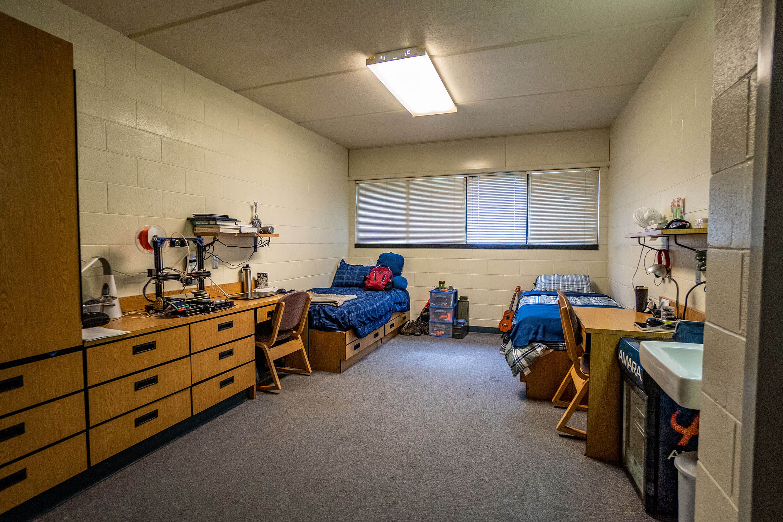 南区宿舍每个房间都铺了地毯,每两个房间共用一个相邻的浴室,三人间中有一个私人浴室。